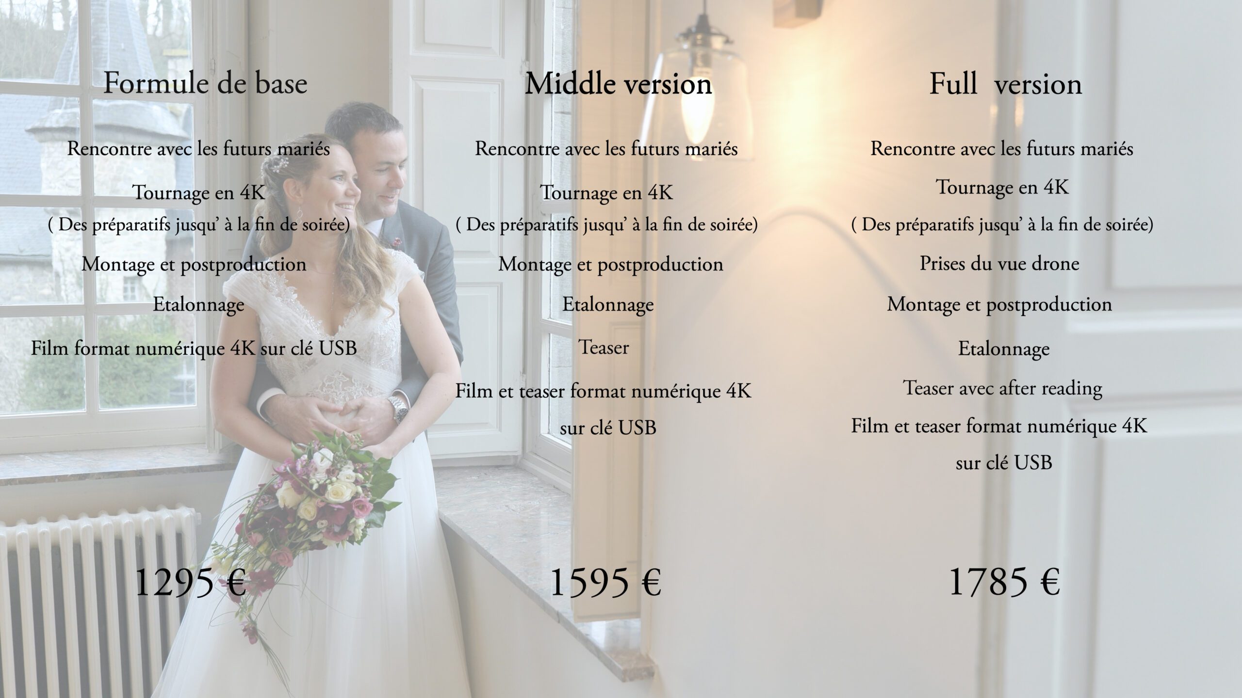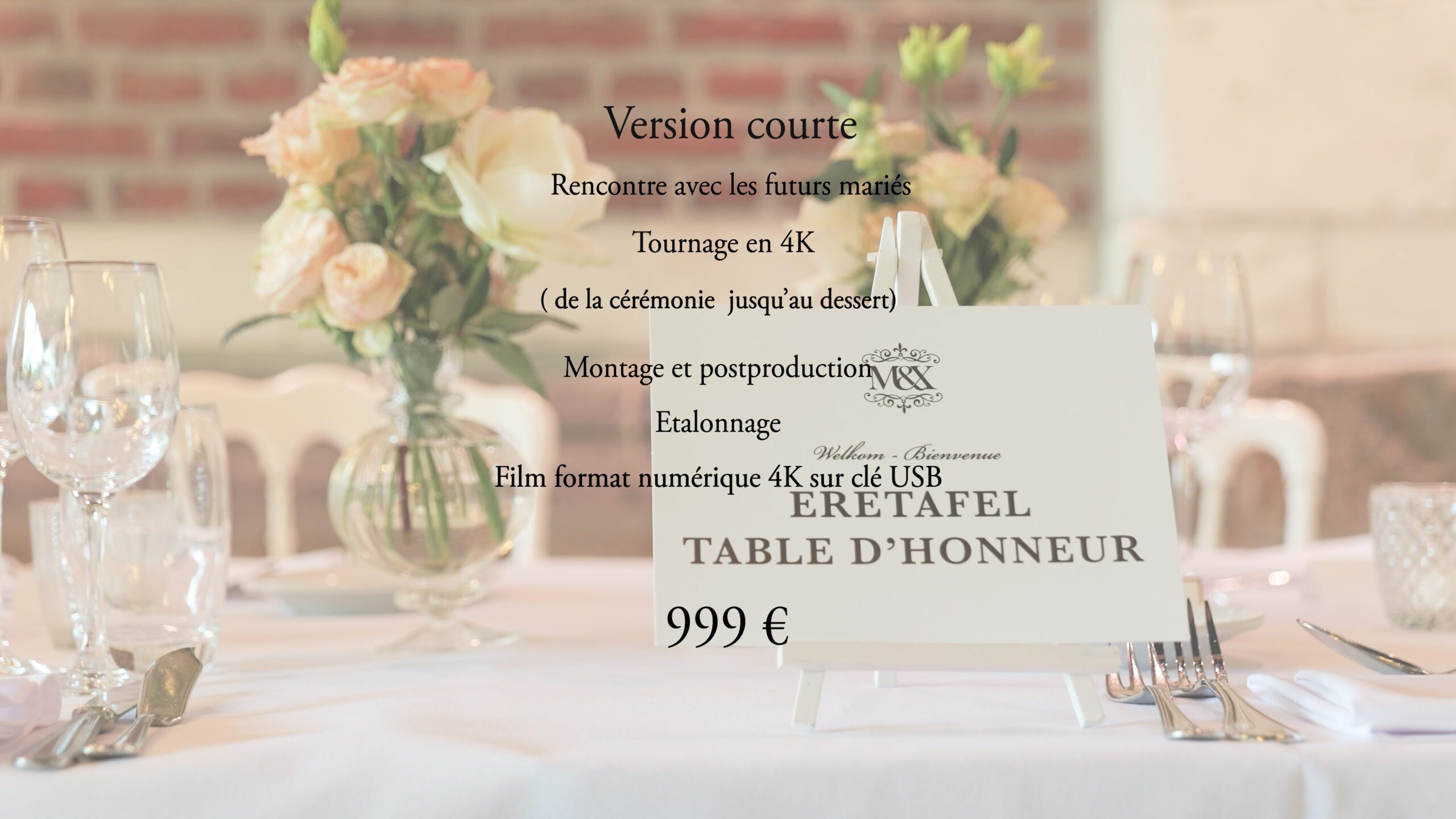 Un véritable court-métrage réalisé avant le mariage et projeté lors des festivités (repas, soirée) de la journée de célébration. Sous base d’un scénario vous mettant en scène (demande en mariage, remerciements, etc…), le court métrage se déclinera sous différentes formes selon vos souhaits : clip vidéo, film dialogué, film muet. Nous établissons ensemble le genre sur lequel vous voulez aborder le film : émotion, comédie, dramaturgie….Le jour j , vous surprendrez et marquerez les esprits de vos convives par la projection de votre film. J’apporte le matériel nécessaire. Vous devenez par cette occasion de véritables stars. Ils ne s’y attendront pas !!